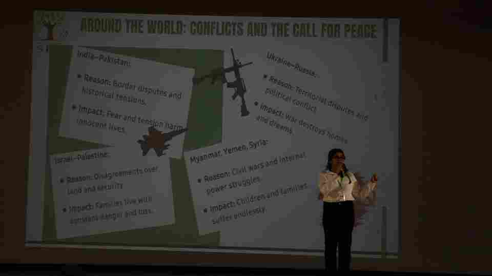 Swarnprastha Public School witnessed an extraordinary and unforgettable event on 3 October 2025, as Class 10 students staged a powerful campaign against the horrors of war. With striking clarity, Saanvi, Kashvi and Poorvi presented case studies on the catastrophic Russia–Ukraine and Israel–Palestine conflicts, exposing their grim realities. The momentum continued with compelling activities by Dhwani, Priyanshi and Yashvi, designed to awaken empathy and provoke reflection on the devastating toll of violence on humanity. The initiative resounded with a transformative call, inspiring future policymakers and leaders to embrace peace, justice and harmony as humanity’s true destiny.