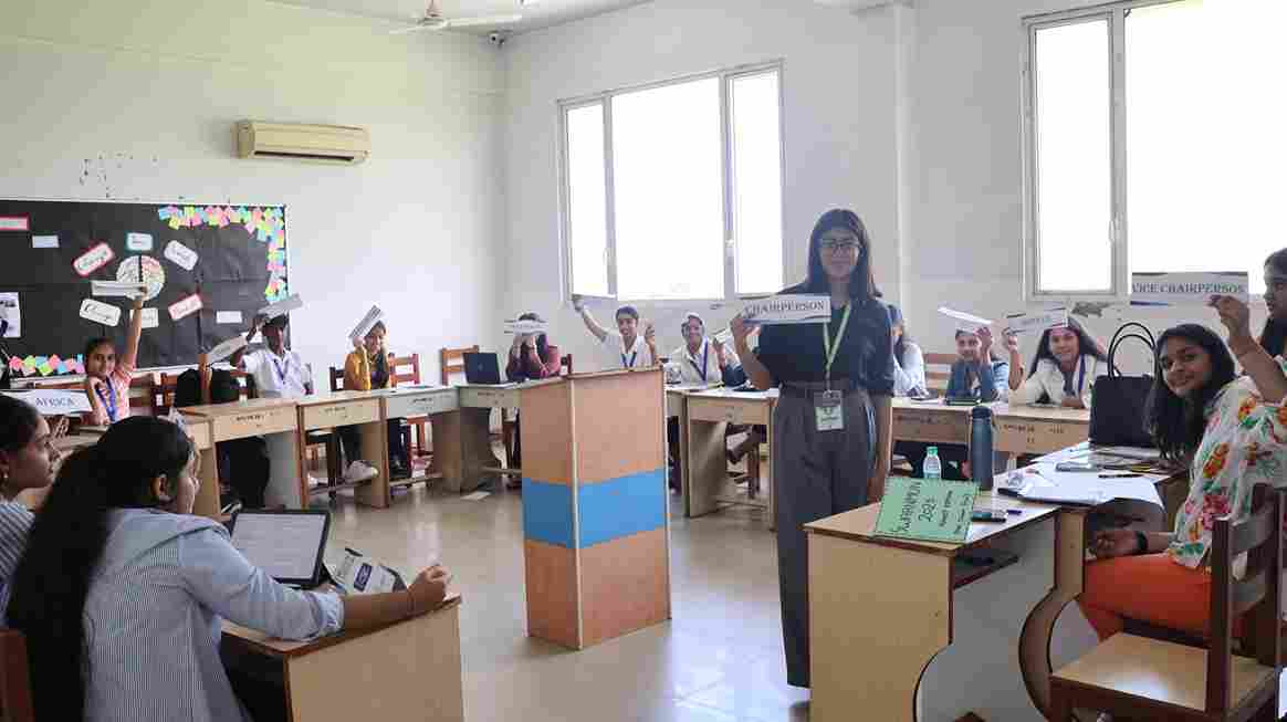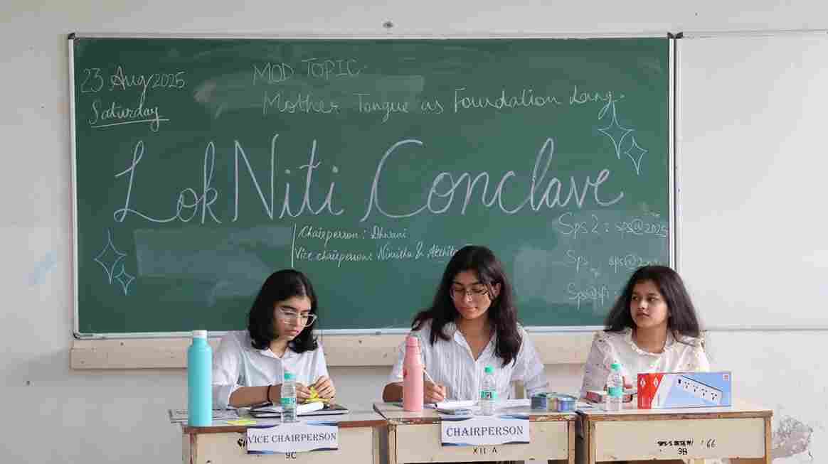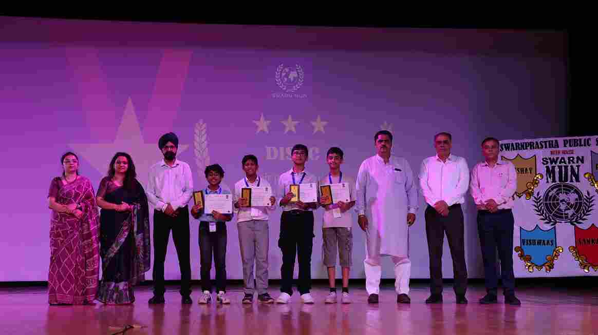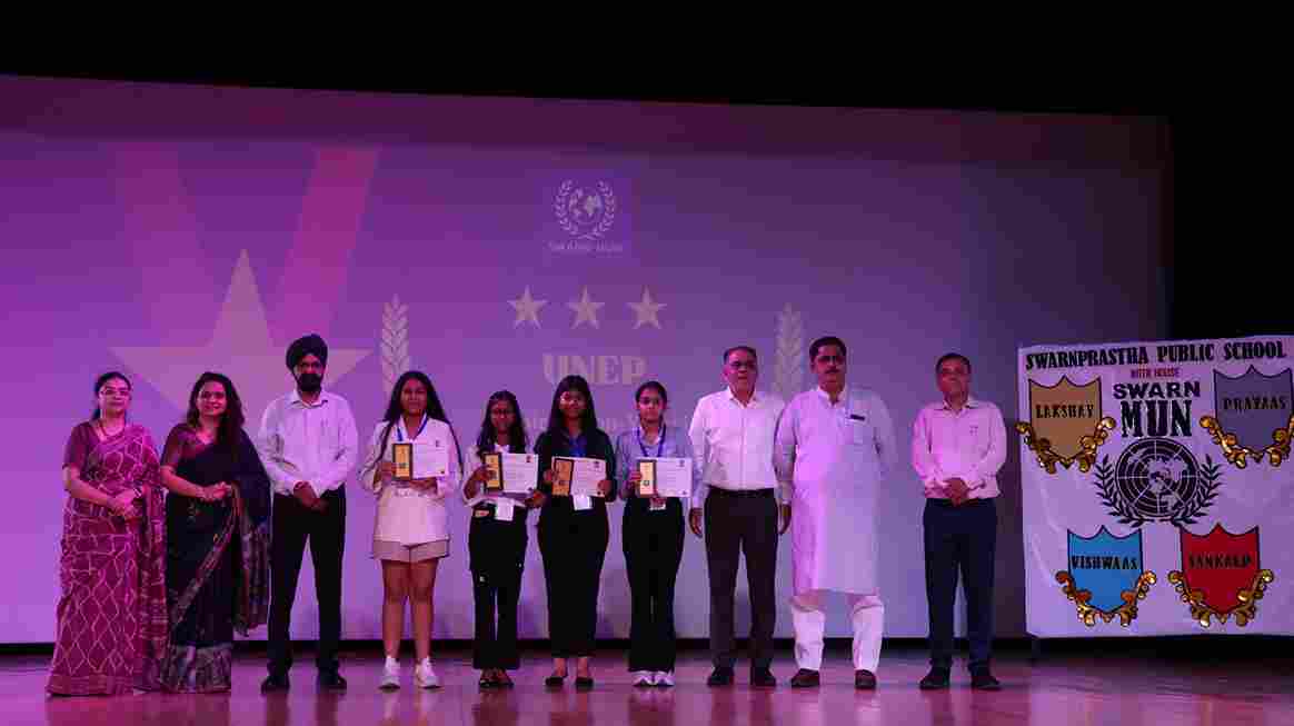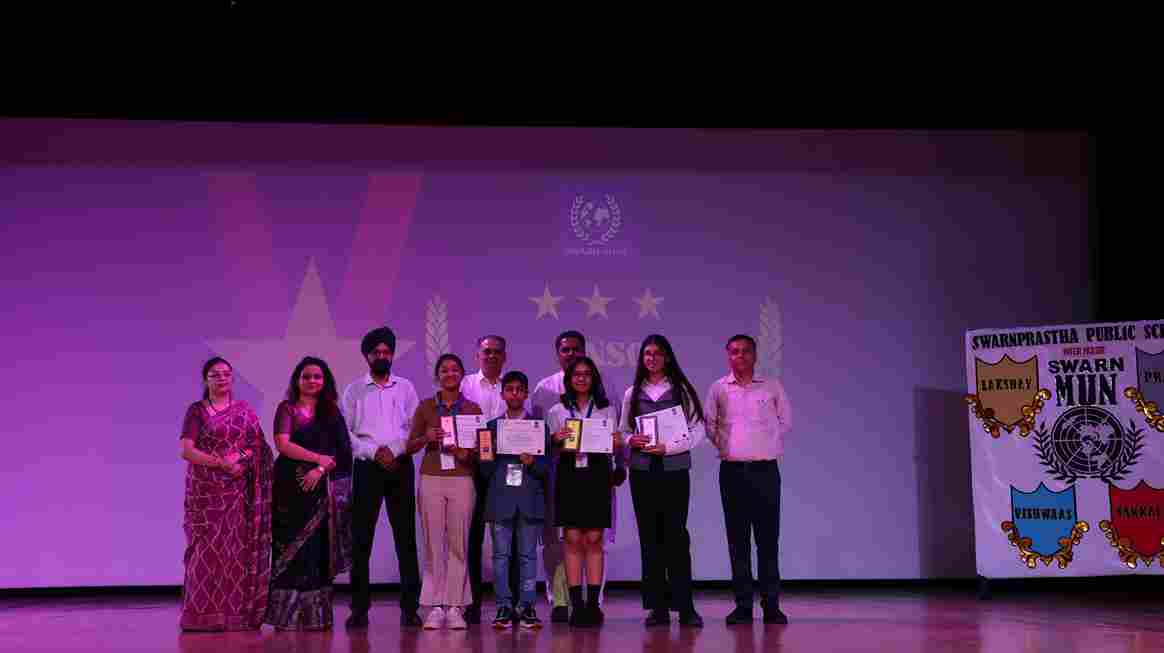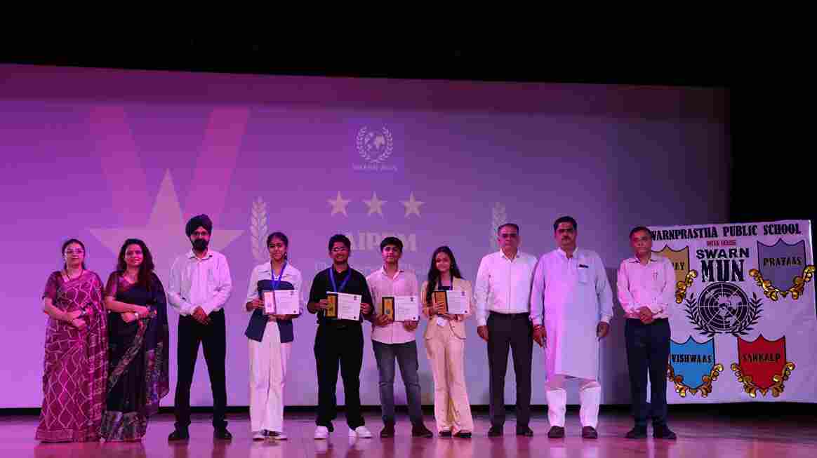 Day 2 of SWARNMUN at Swarnprastha Public School on August 24, 2025, crackled with energy as delegates engaged in fiery debates, thought provoking discussions and creative expression through paintings, slogans and posters. What began as disagreements transformed into moments of consensus, with students mastering the art of listening, valuing differences and embracing new perspectives. The grand finale, the Award Ceremony, celebrating excellence, unique ideas and out of the box thinking, was graced by Chief Guest Sh. Sumit Rana, President of JJP (Sonipat) and Guest of Honour, Er. Sandeep Dahiya, North India Sales Head, JSW, who urged these future leaders to blend intellect with empathy.